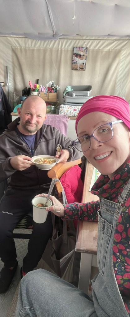 Regen was gelukkig maar één maling en natuurlijk hadden we een uitstapje gepland naar de plaatselijke markt . Hoeveel regen kan er vallen op een half uurtje ? Zeer veel als je moet schuilen onder een zeiltje. Plezier moet je zelf maken en na een hele tijd zijn we er gewoon door gegaan . Heb wel gemerkt dat mijn jas niet waterdicht is want de naden van mijn schouders waren nat tot op mijn trui !!