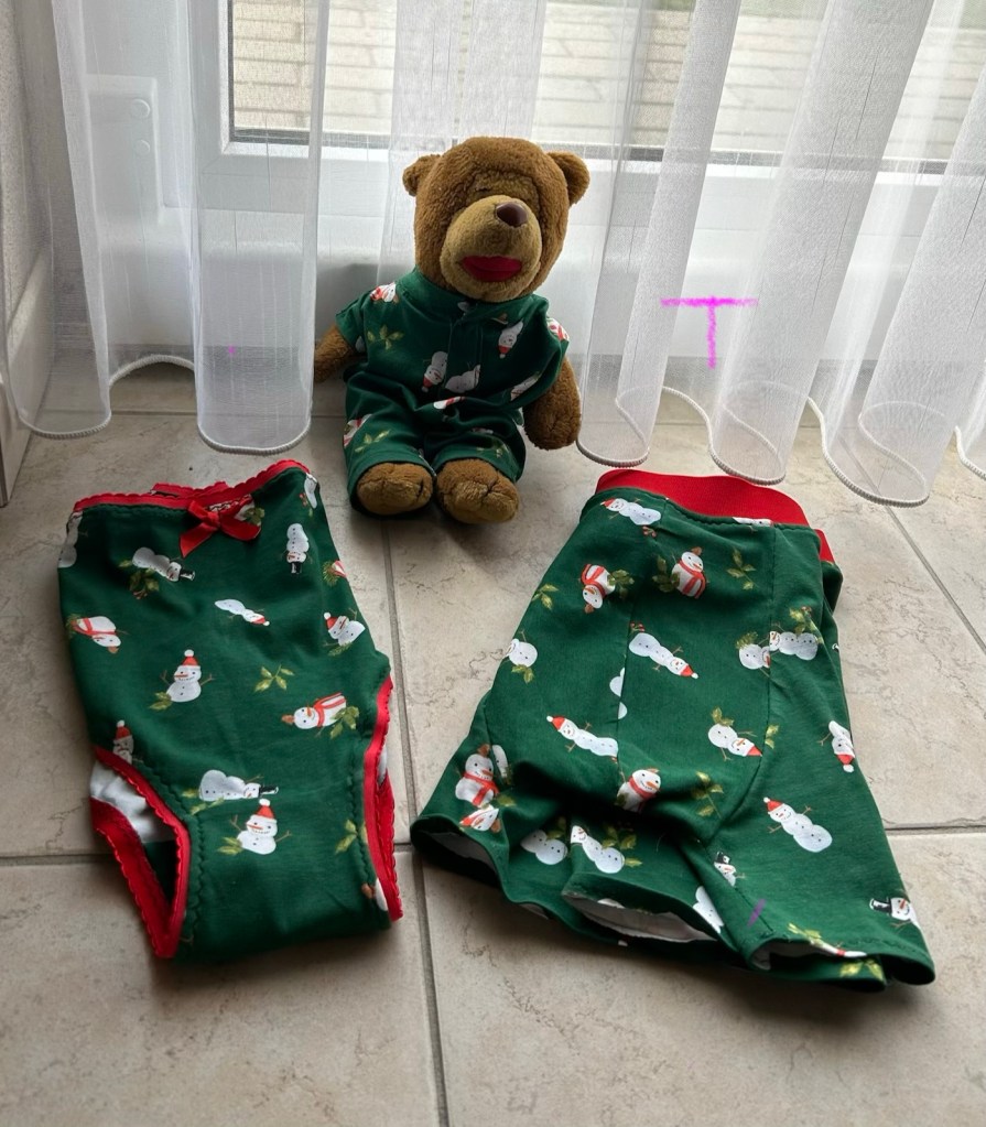 En natuurlijk is mijne Billie zijn kerstcadeau klaar geraakt . Wat een geslaagd en onverwachts cadeautje was dit . Boxers maken is wel iets anders dan broekjes voor mij . Die kan ik al maken met mijn ogen toe . Elk momentje dat Billie weg was even verder naaien . Hij was er zeer blij mee en ze passen goed ,dat is het belangrijkste . Hij had wel niet verwacht dat ik ook onderbroekjes van hetzelfde stofje gemaakt had . En degene die mij al goed kennen gebruik ik de restjes graag voor een rompertje van onze Ben de beer !!