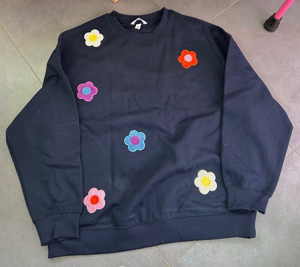 En zoals de meeste al weten draag ik graag kleurtjes en motiefjes . En als je het niet in de winkel vind pimp ik het wel. Dus we nemen een saaie trui en naaien daar bloemen op . Weg simpele blauwe trui .