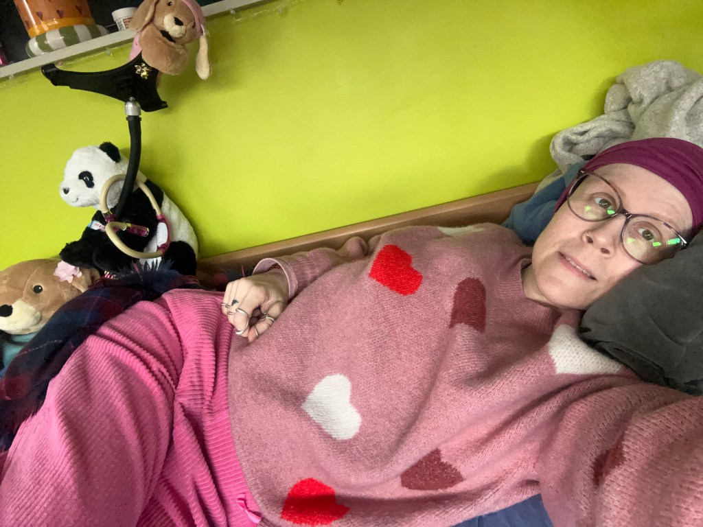 Ik ben sowieso iemand die veel slaap en rust nodig heeft . Mijn wekker gaat af om 11 h en dan probeer ik op te staan . Of zoals het vaak gaat sta ik eventjes op voor medicatie ,sondevoeding en ga erna terug liggen tot de thuisverpleging er is .