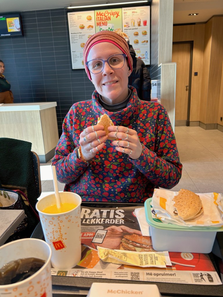 Ook zijn we enkele weken geleden nog eens naar de McDonald‘s geweest voor een glutenvrije hamburger . Voor mij is dat max een half broodje en weet ook dat ik dit erna bekoop met buikpijn ,misselijke en vaak diarree . Maar ik eet dit zo weinig dat ik dat er voor over heb . Ben gelukkig al getraind in plastic bakjes meenemen . Wij gaan geen voedsel verspillen.