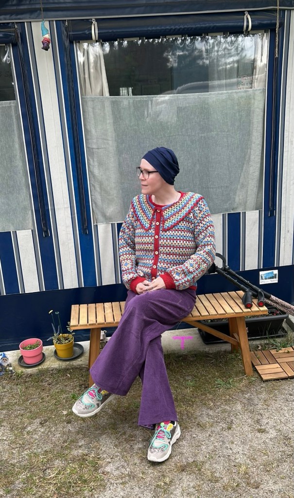 Ik heb het al meer gezegd, je bent een kanjer door zo positief in het leven tw staan en zoveel mooie dingen maken. Je vest is prachtig, zo knap om dar allemaal zo uit te rekenen dat het mooi past. En ook die rolstoel tas, zo vrolijk en zo mooi.