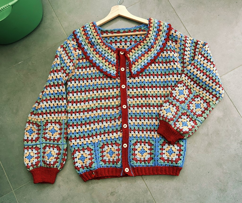 Heb wel een ander leuk project klaar . Mijn gehaakt vestje . Zeg het niet vaak maar wat ben ik er trots op . Was ook een heel werkje qua bedenken hoe en wat . Want had hier geen patroon van dus een heel werkje van veel tellen en uitrekenen .