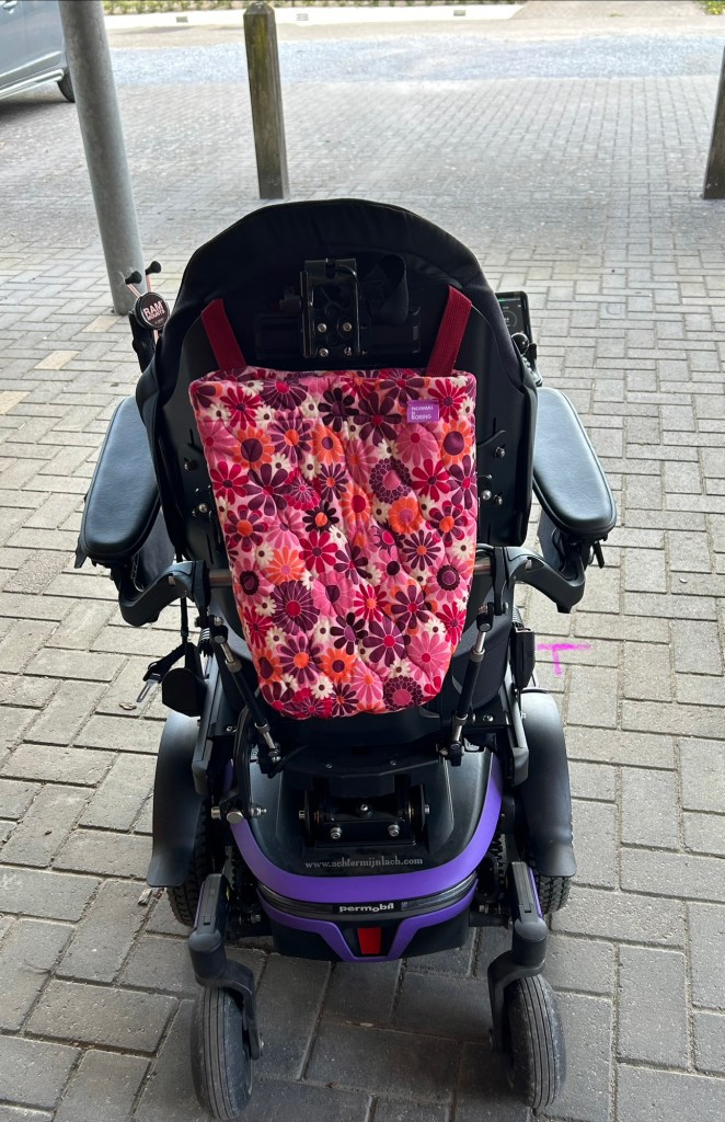 Ook heb ik een leuk tasje gemaakt voor mijn elektrische rolstoel .Ik merkte dat mijn haken voor de tas aan te hangen redelijk laag bevestigd zijn . Dus een tas is vaak te lang . En zoals jullie mij al kennen probeer ik dan een oplossing te vinden . Bij deze dus een op maat gemaakte tas . Zeer ruim want heeft een grote bodem . En natuurlijk kies ik dan ook een vrolijk stofje . Past ook perfect bij mijn rolstoel .