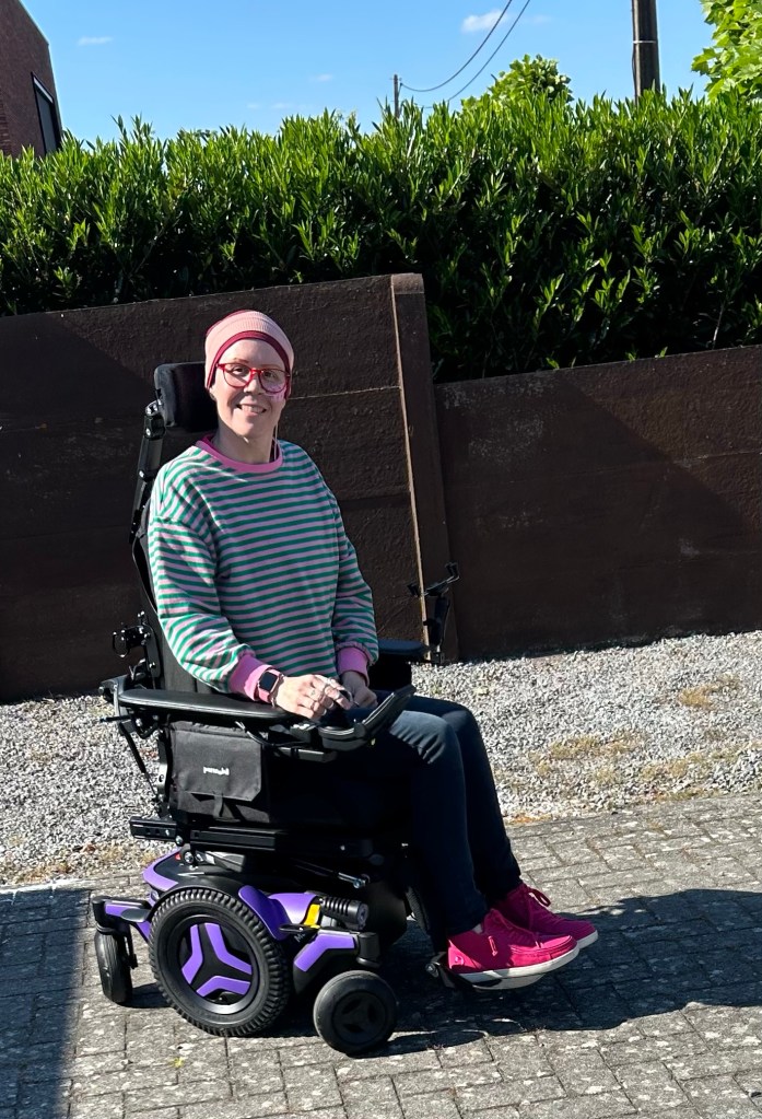 Ah ja . Ik heb nog iets leuk te melden . Ik heb mijn elektrische rolstoel ontvangen . En hoe zalig rijd deze !! Het is hetzelfde type en merk als de vorige maar dan nog . Deze heeft een aangepaste rug en dergelijke . Ook kan ik bij deze bijna plat liggen . Heb al enkele kilometers op de teller . Mijn vorige staat op de camping en heb daar nu ook een degelijke rolstoel .
