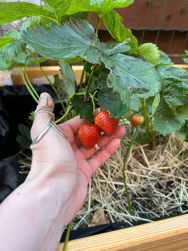 Over mijn tuintje gesproken . Wat groeit en bloeit alles goed dit jaar . Wat heb ik al zoveel aardbeien kunnen eten . Ook mijn blauwe bessen en radijsjes zijn aan het uitkomen . Er is toch niets fijner dan zelfgekweekte groentjes en fruit .